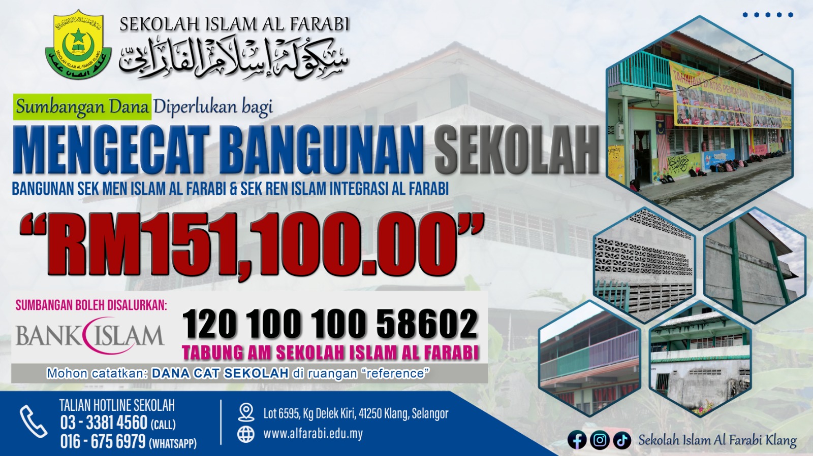 Kutipan sumbangan bagi menampung perbelanjaan kos mengecat semula bangunan Sekolah Islam Al Farabi diperlukan. Setelah sekian lama bangunan sekolah tidak dicatkan semula, kini projek bagi keceriaan bangunan sekolah giat dilakukan. Bangunan sekolah yang akan dicatkan semula ini terdiri daripada Sekolah Menengah Islam Al Farabi (Keseluruhan Bangunan 3 Tingkat) dan Sekolah Rendah Islam Integrasi Al Farabi (Keseluruhan Blok A Bangunan 2 Tingkat).