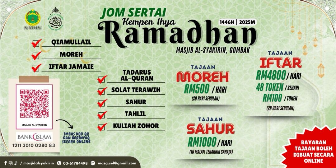 Available Payments Invoice History Tabung Ihya Ramadan 1446H Tabung Ihya Ramadan 1446H ini untuk membiayai program-program keagamaan sepanjang bulan Ramadan 1446H / 2025M Go to Payment Tabung Masjid Al Syakirin Gombak Jom Raih Redha Allah dengan menyumbang Go to Payment Tabung Naik Taraf Sistem Audio (PA System) Go to Payment Tabung Sedekah Subuh & Jumaat Go to Payment Tabung Wang Tidak Patuh Syaiah Go to Payment