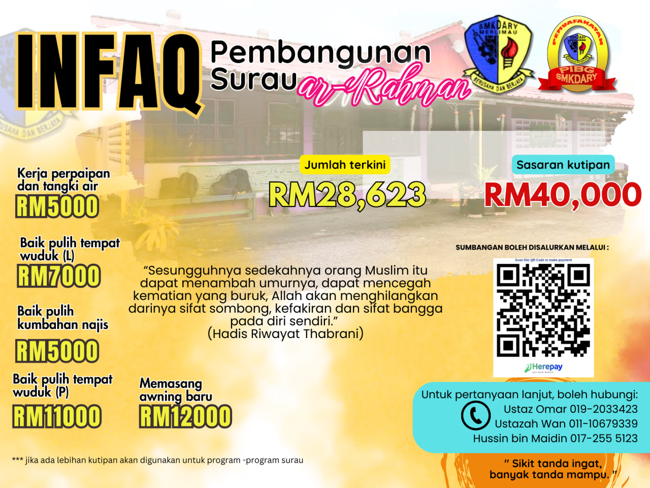 Kutipan bertujuan untuk melakukan kerja baik pulih dan penyelenggaraan bangunan serta struktur serta menaik taraf kemudahan surau bagi kegunaan murid dan seluruh warga kerja SDARY.