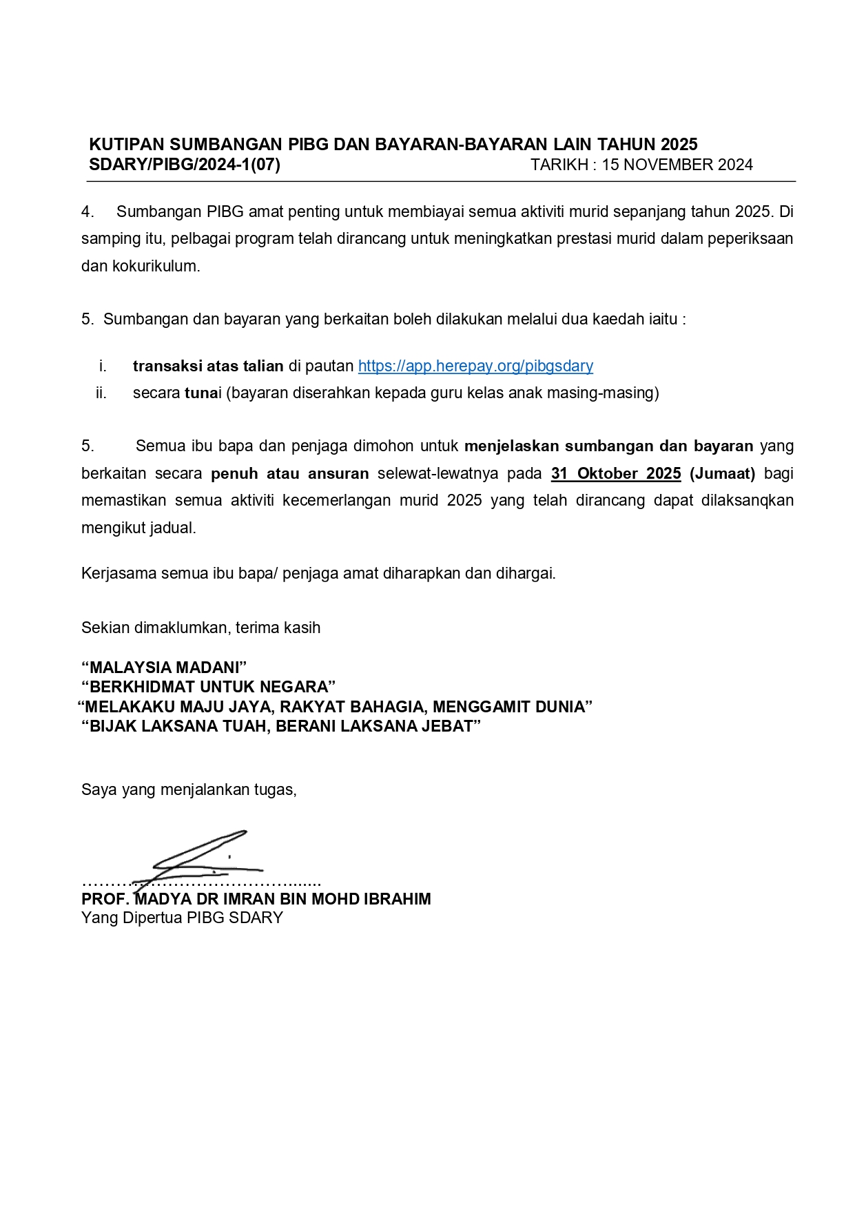 Sumbangan ini bertujuan untuk menampung perbelanjaan aktiviti murid dan pembangunan sekolah.