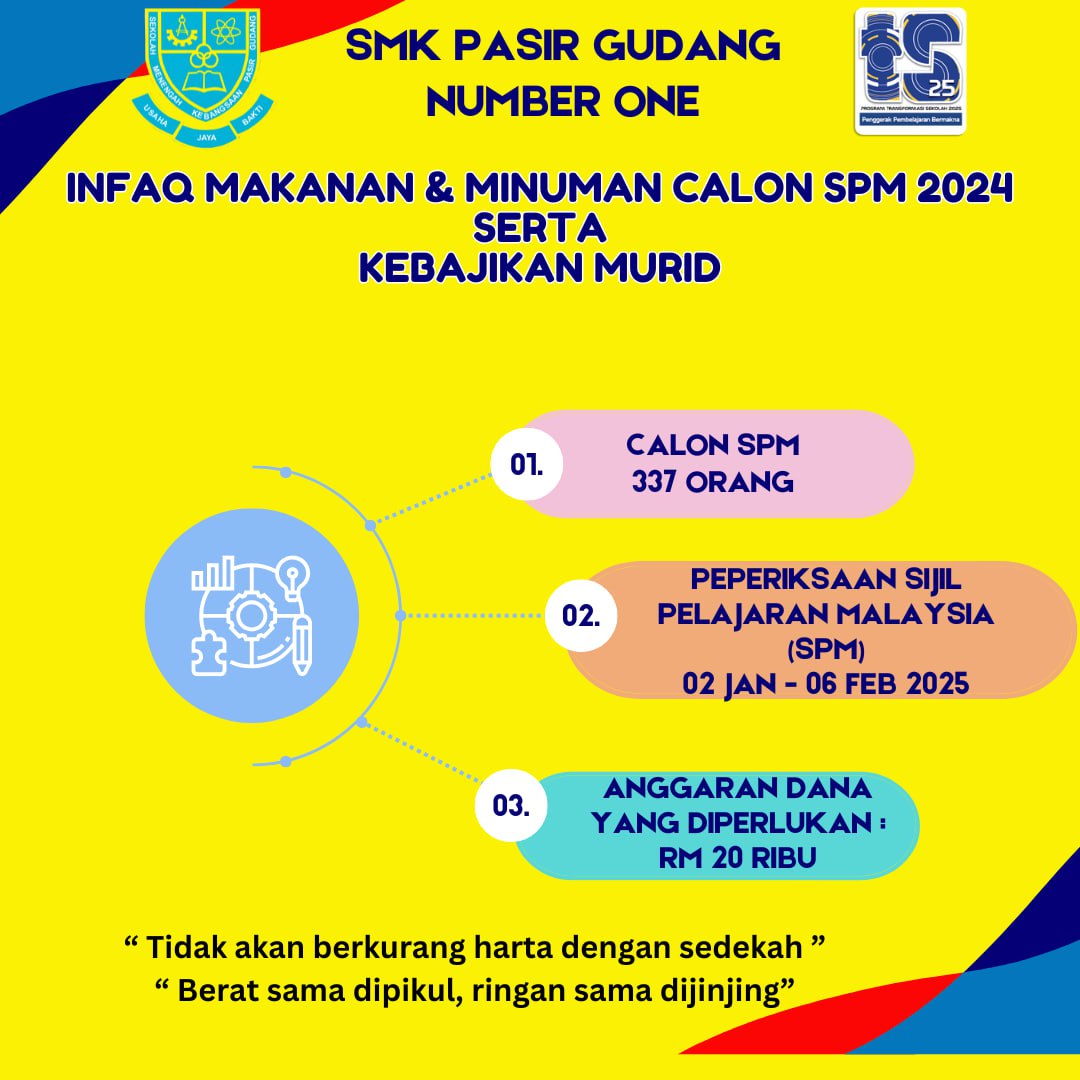 Pihak PIBG SMK Pasir Gudang memohon sumbangan bagi menampung perbelanjaan makanan dan minuman calon SPM 2024 serta kebajikan murid SMK Pasir Gudang.