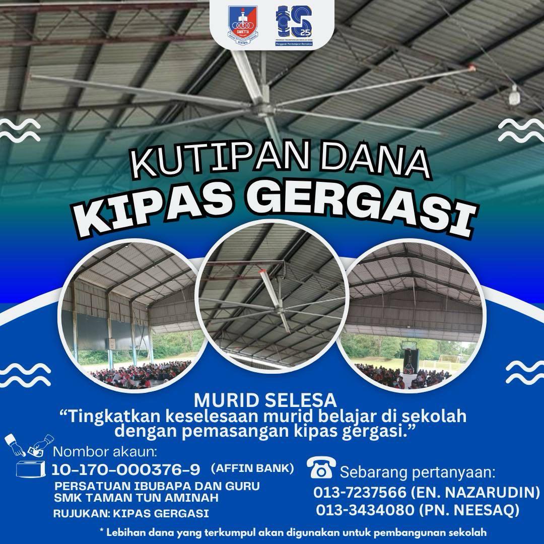 SMK Taman Tun Aminah dengan kerjasama PIBG SMK Taman Tun Aminah kini menjalankan kutipan Sumbangan Dana Kipas Gergasi bagi meningkatkan keselesaan murid ketika berada di dewan.