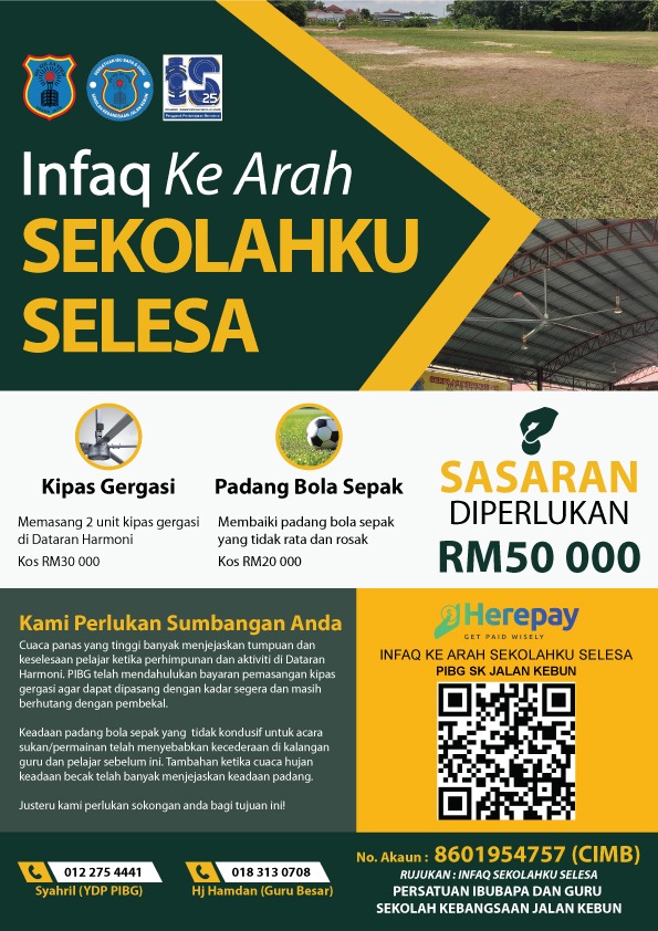 Salurkan sumbangan ikhlas Tuan/Puan melalui akaun PIBG SKJK untuk dimanfaatkan bagi kegunaan pembelian Kipas Gergasi dan Projek Padang Bola Sepak.