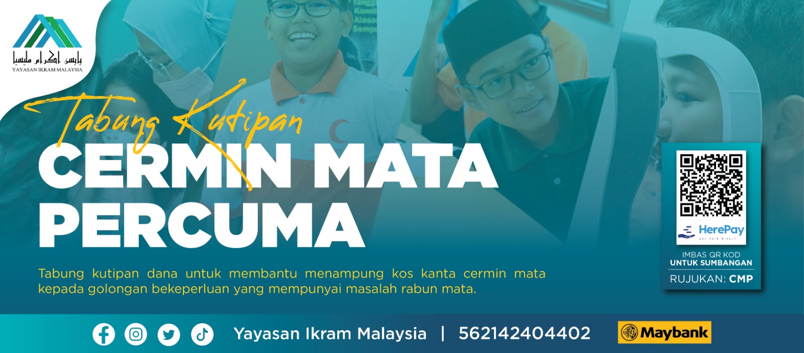 Mendukung semangat dalam meningkatkan kesedaran tentang kepentingan penjagaan kesihatan mata dalam kalangan individu, keluarga dan komuniti serta memastikan taraf mutu pendidikan pelajar yang berkualiti, Yayasan Ikram Malaysia telah melancarkan tabung dana Program Cermin Mata Percuma (CMP) yang dijalankan sepanjang tahun.